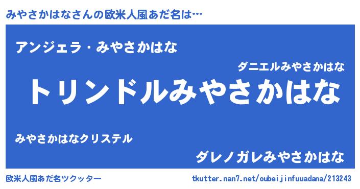 | 男性向けラノベタイトル風あだ名 | 『みやさかはな~年齢イコール彼女いない歴の魔法使い~』 |