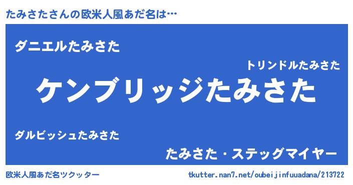 | 男性向けラノベタイトル風あだ名 | 『Re:たみさたから始める異世界生活』 |