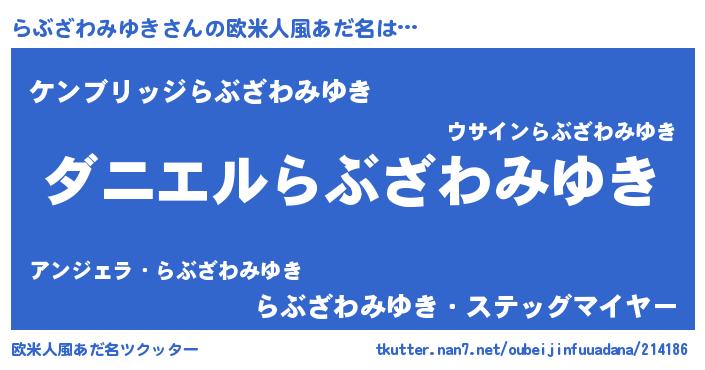 | 男性向けラノベタイトル風あだ名 | 『おまえをオタクにしてやるから、俺をらぶざわみゆきにしてくれ! 』 |