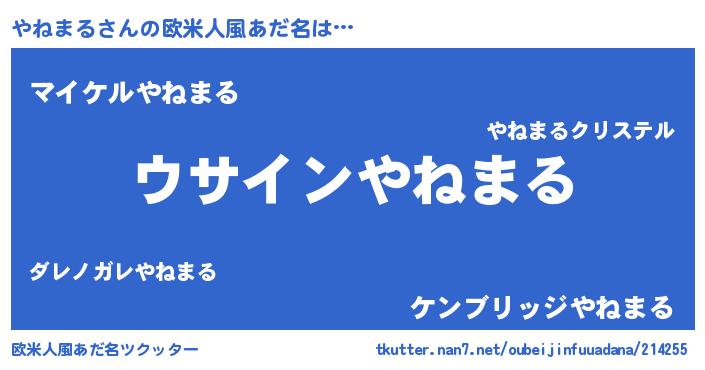 | 男性向けラノベタイトル風あだ名 | 『やねまるの嫁は女の子じゃないと思った?』 |