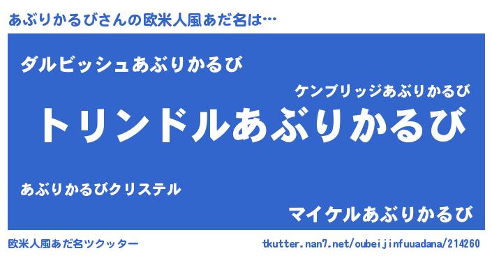 | 男性向けラノベタイトル風あだ名 | 『あぶりかるび~年齢イコール彼女いない歴の魔法使い~』 |
