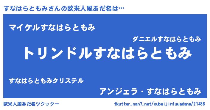 | 男性向けラノベタイトル風あだ名 | 『すなはらともみ~年齢イコール彼女いない歴の魔法使い~』 |