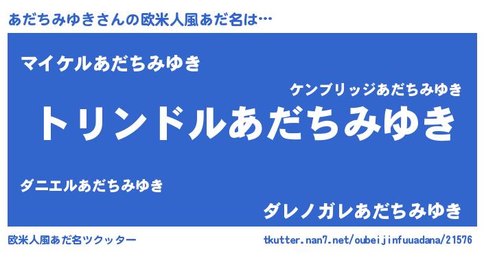 | 男性向けラノベタイトル風あだ名 | 『あだちみゆき~年齢イコール彼女いない歴の魔法使い~』 |