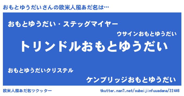 | 男性向けラノベタイトル風あだ名 | 『おもとゆうだい~年齢イコール彼女いない歴の魔法使い~』 |