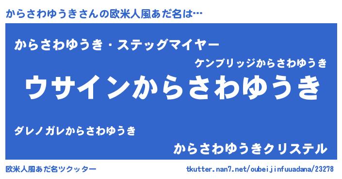 | 女子向けラノベタイトル風あだ名 | 『からさわゆうきの卵を拾いまして』 |