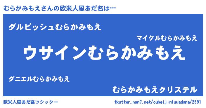 | 女子向けラノベタイトル風あだ名 | 『むらかみもえの卵を拾いまして』 |