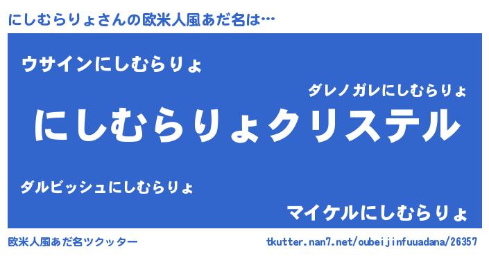 | 男性向けラノベタイトル風あだ名 | 『やはりにしむらりょの青春ラブコメはまちがっている 』 |