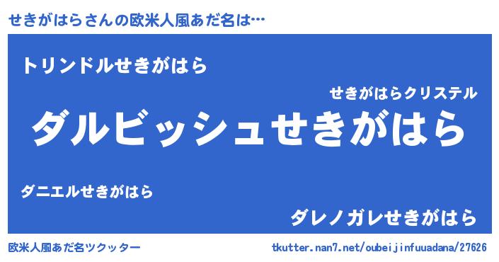 | 男性向けラノベタイトル風あだ名 | 『せきがはらという概念が存在しない退屈な世界 』 |