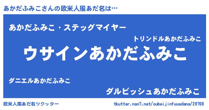 | 男性向けラノベタイトル風あだ名 | 『あかだふみこの嫁は女の子じゃないと思った?』 |