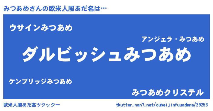| 男性向けラノベタイトル風あだ名 | 『みつあめという概念が存在しない退屈な世界 』 |