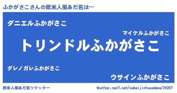 | 男性向けラノベタイトル風あだ名 | 『ふかがさこ~年齢イコール彼女いない歴の魔法使い~』 |