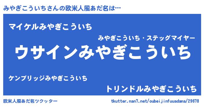 | 男性向けラノベタイトル風あだ名 | 『みやぎこういちの嫁は女の子じゃないと思った?』 |