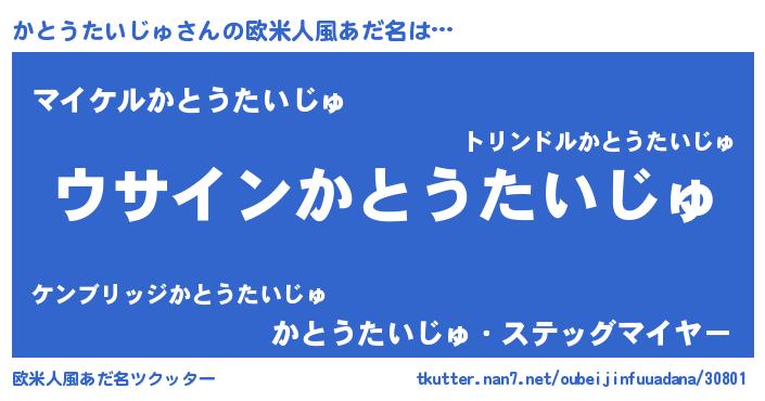 | 女子向けラノベタイトル風あだ名 | 『かとうたいじゅの卵を拾いまして』 |