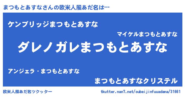 | 女子向けラノベタイトル風あだ名 | 『乙女ゲームの破滅フラグしかない悪役まつもとあすなに転生してしまった…』 |