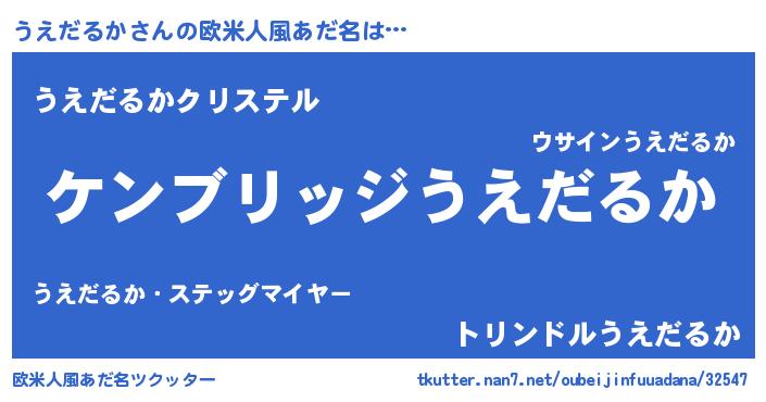 | 男性向けラノベタイトル風あだ名 | 『Re:うえだるかから始める異世界生活』 |