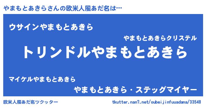 | 男性向けラノベタイトル風あだ名 | 『やまもとあきら~年齢イコール彼女いない歴の魔法使い~』 |