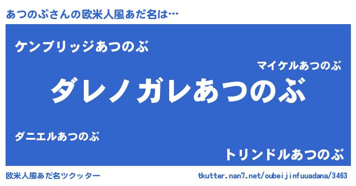 | 男性向けラノベタイトル風あだ名 | 『魔弾の王とあつのぶ』『あつのぶの憂鬱』 |