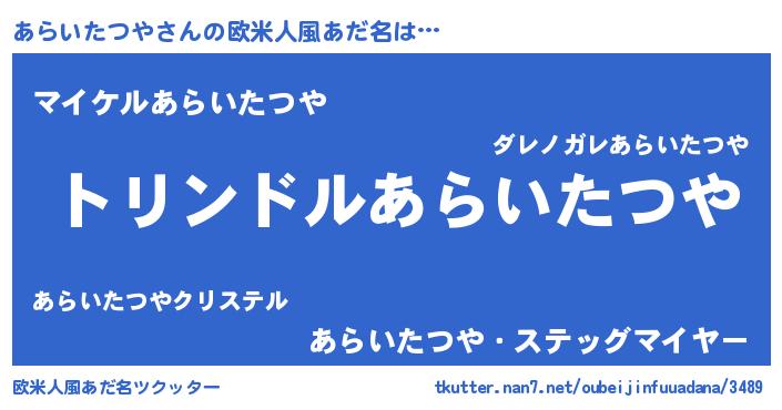| 男性向けラノベタイトル風あだ名 | 『あらいたつや~年齢イコール彼女いない歴の魔法使い~』 |
