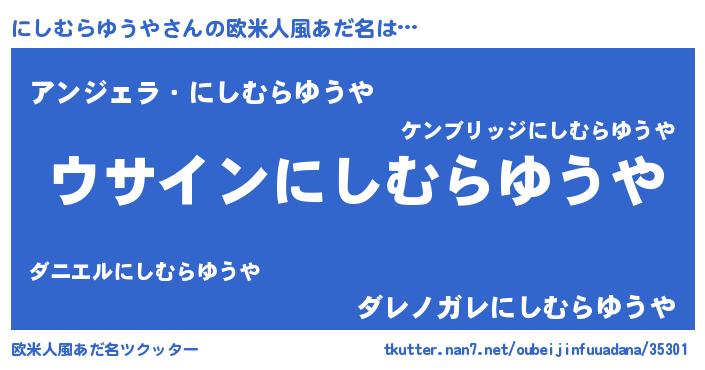 | 男性向けラノベタイトル風あだ名 | 『にしむらゆうやの嫁は女の子じゃないと思った?』 |