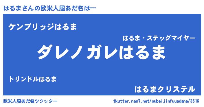 | 男性向けラノベタイトル風あだ名 | 『この素晴らしい世界にはるまを!』 |