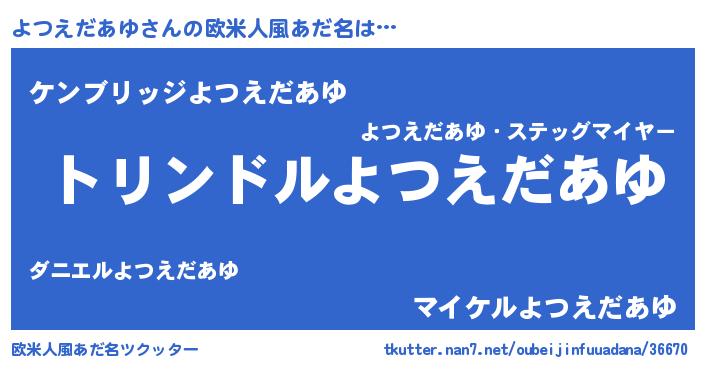 | 男性向けラノベタイトル風あだ名 | 『よつえだあゆ~年齢イコール彼女いない歴の魔法使い~』 |