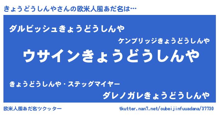 | 男性向けラノベタイトル風あだ名 | 『きょうどうしんやの嫁は女の子じゃないと思った?』 |