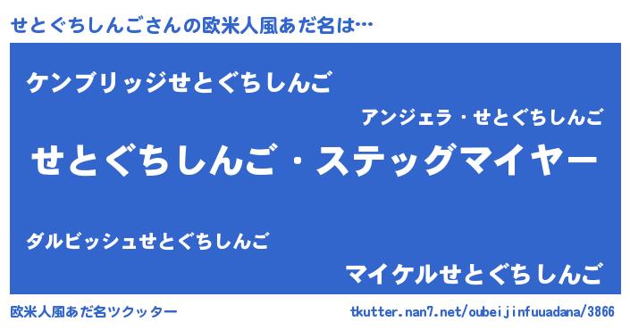 | 男性向けラノベタイトル風あだ名 | 『冴えないせとぐちしんごの育てかた』 |