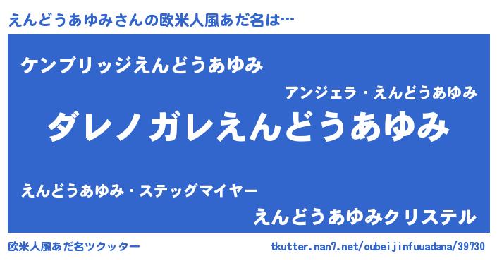 | 女子向けラノベタイトル風あだ名 | 『乙女ゲームの破滅フラグしかない悪役えんどうあゆみに転生してしまった…』 |