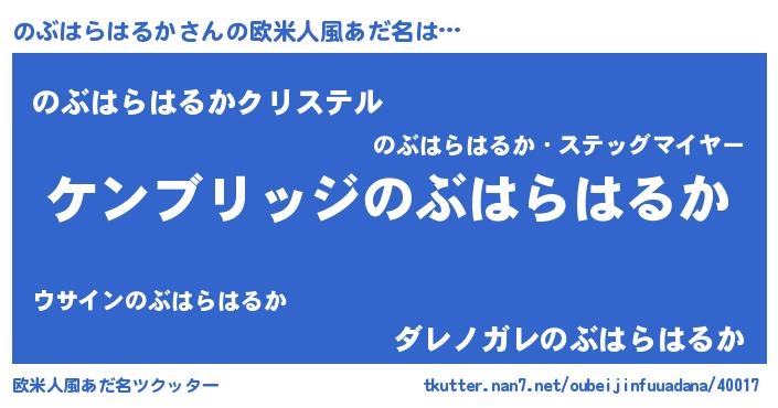 | 男性向けラノベタイトル風あだ名 | 『Re:のぶはらはるかから始める異世界生活』 |