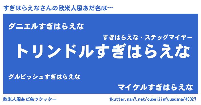 | 男性向けラノベタイトル風あだ名 | 『転生したらすぎはらえなだった件』 |