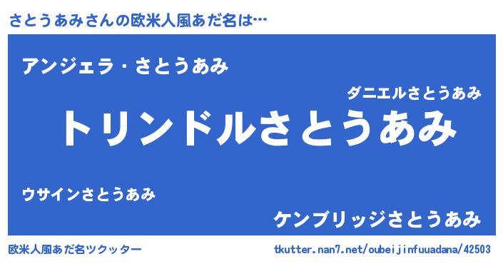 | 男性向けラノベタイトル風あだ名 | 『さとうあみ~年齢イコール彼女いない歴の魔法使い~』 |