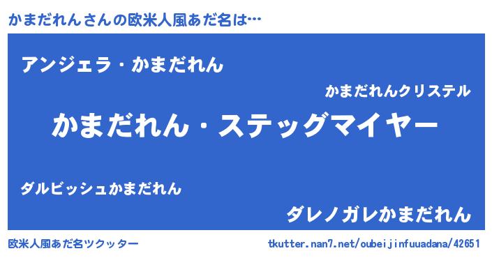 | 男性向けラノベタイトル風あだ名 | 『うちのかまだれんが世界を掌握している!』 |