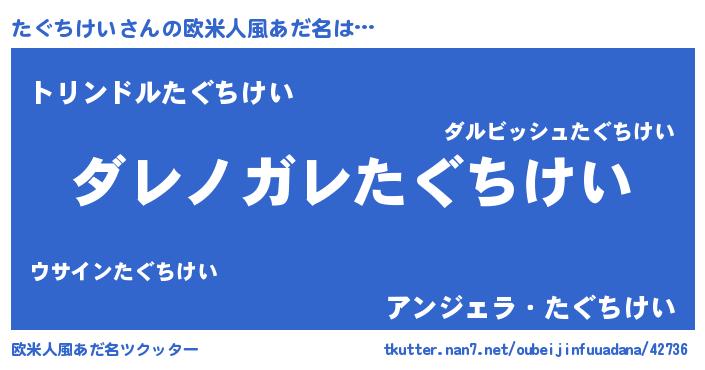 | 男性向けラノベタイトル風あだ名 | 『魔弾の王とたぐちけい』 |
