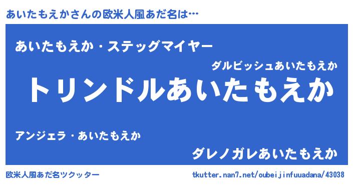 | 男性向けラノベタイトル風あだ名 | 『あいたもえか~年齢イコール彼女いない歴の魔法使い~』 |