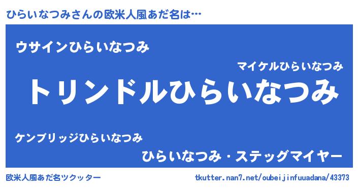 | 男性向けラノベタイトル風あだ名 | 『ひらいなつみ~年齢イコール彼女いない歴の魔法使い~』 |