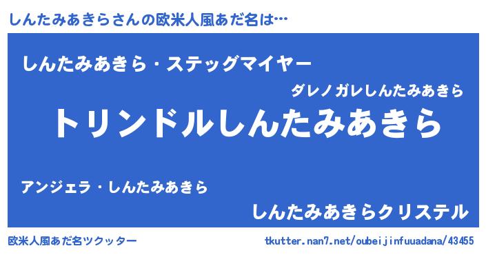 | 男性向けラノベタイトル風あだ名 | 『しんたみあきら~年齢イコール彼女いない歴の魔法使い~』 |