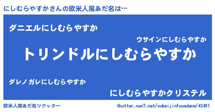 | 女子向けラノベタイトル風あだ名 | 『にしむらやすかの玉の輿計画!』 |