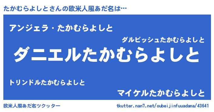 | 男性向けラノベタイトル風あだ名 | 『おまえをオタクにしてやるから、俺をたかむらよしとにしてくれ! 』 |