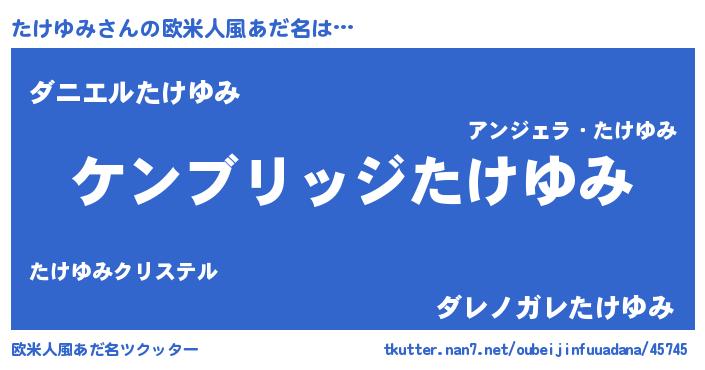 | 男性向けラノベタイトル風あだ名 | 『Re:たけゆみから始める異世界生活』 |