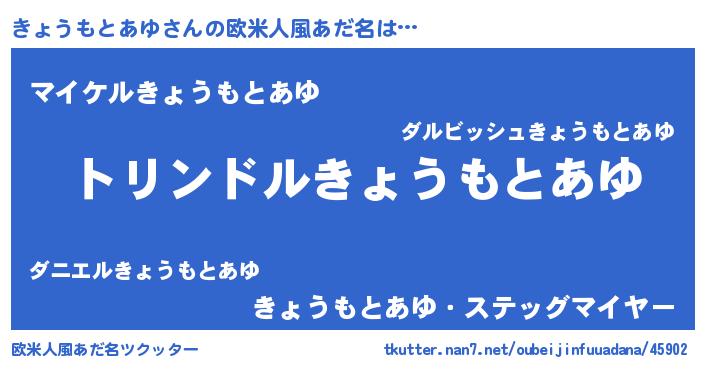 | 男性向けラノベタイトル風あだ名 | 『きょうもとあゆ~年齢イコール彼女いない歴の魔法使い~』 |