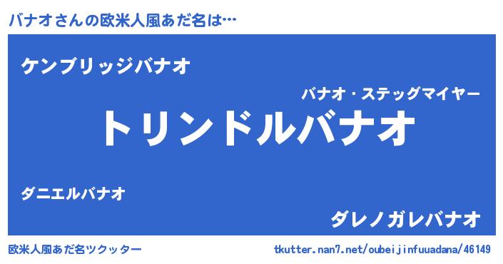 | 男性向けラノベタイトル風あだ名 | 『バナオ~年齢イコール彼女いない歴の魔法使い~』 |