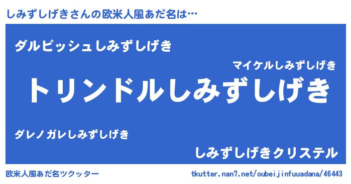 | 男性向けラノベタイトル風あだ名 | 『しみずしげき~年齢イコール彼女いない歴の魔法使い~』 |