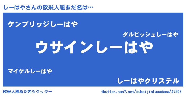 | 男性向けラノベタイトル風あだ名 | 『しーはやの嫁は女の子じゃないと思った?』 |