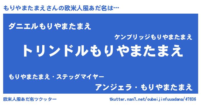 | 男性向けラノベタイトル風あだ名 | 『もりやまたまえ~年齢イコール彼女いない歴の魔法使い~』 |
