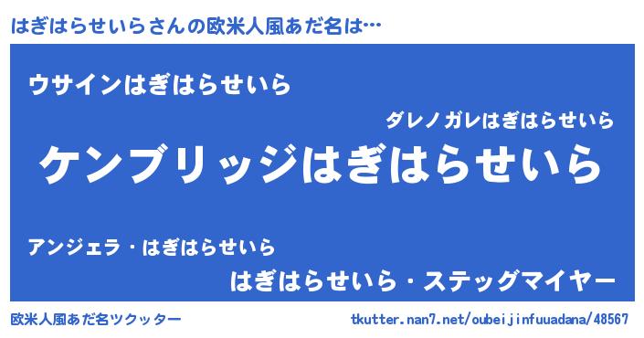 | 男性向けラノベタイトル風あだ名 | 『Re:はぎはらせいらから始める異世界生活』 |