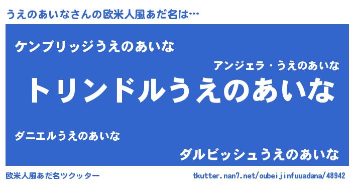 | 男性向けラノベタイトル風あだ名 | 『うえのあいな~年齢イコール彼女いない歴の魔法使い~』 |