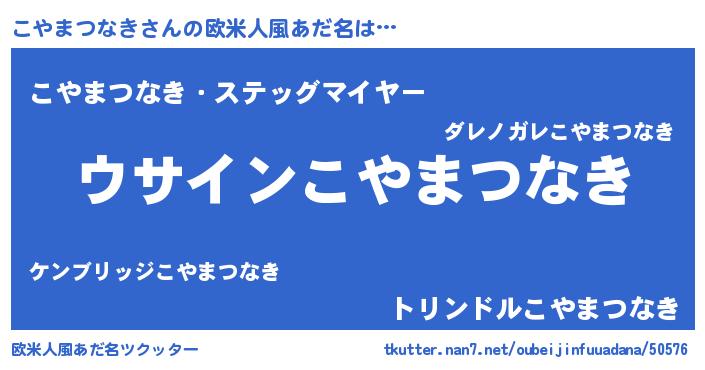 | 男性向けラノベタイトル風あだ名 | 『こやまつなきの嫁は女の子じゃないと思った?』 |