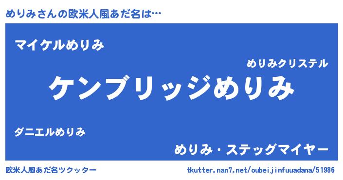| 男性向けラノベタイトル風あだ名 | 『Re:めりみから始める異世界生活』 |