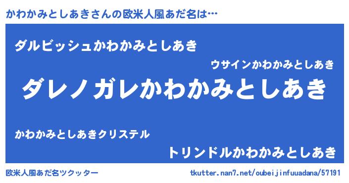 | 男性向けラノベタイトル風あだ名 | 『この素晴らしい世界にかわかみとしあきを!』 |