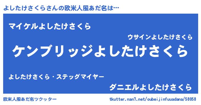 | 男性向けラノベタイトル風あだ名 | 『Re:よしたけさくらから始める異世界生活』 |